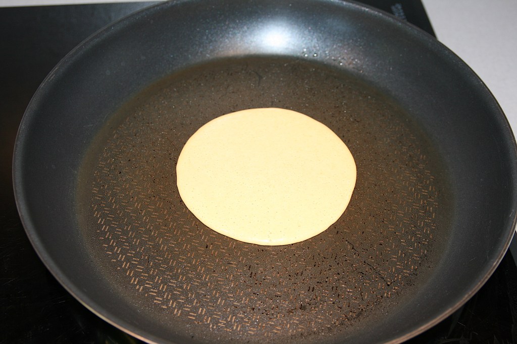 Faite chauffer une poêle à feu moyen et huilez-la très légèrement avec de l’essuie-tout imbibé d’huile neutre. Versez une petite louche de préparation dans la poêle